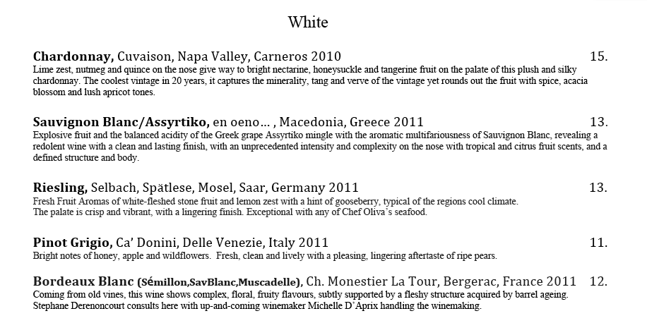 Patrons of Delmonico’s Kitchen in Garment District, NYC, are fortunate enough to have an eclectic option when it comes to white wines by the glass; “En Oeno…” white 2011 (Sauv. Blanc / Assyrtiko 50/50)!